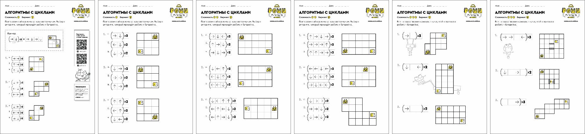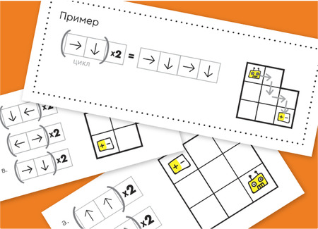 Задание знакомит с понятием «цикл» и наглядно показывает принцип его работы. Нужно подобрать правильные команды цикла алгоритма, чтобы робот пришёл к батарейке.