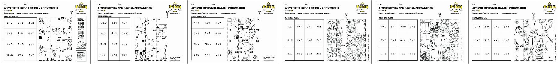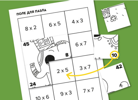 Этот пазл хорош тем, что ребёнок наглядно видит, правильно ли он умножает. Ему предстоит вырезать из шаблона картинки с ответами и поместить их на клетки с примерами. Если всё решено верно, получится изображение.