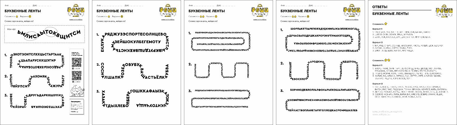 В ленте из букв нужно найти спрятавшиеся слова. Задание тренирует навык чтения и внимательность.