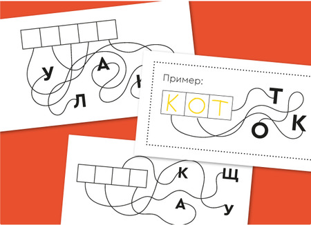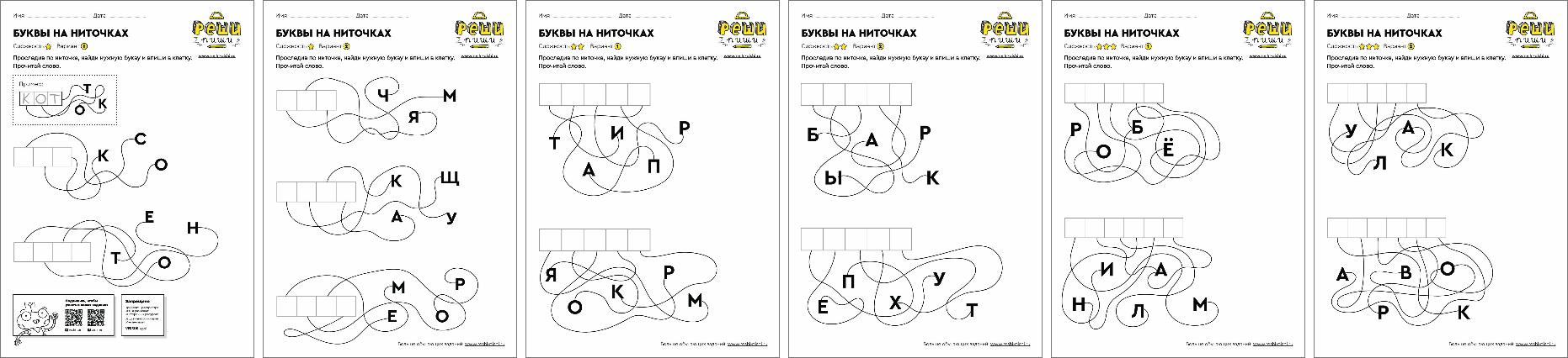 Развиваем внимательность, пространственное мышление, чтение и письмо. Нужно найти букву, проследив по ниточке, и вписать её в клетку. После чего предложите ребёнку прочитать слово.