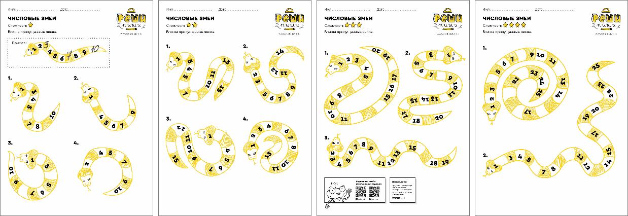 В задании нужно написать пропущенные числа на спине у дружелюбной кобры. Развивается представление числового ряда и навык письма.