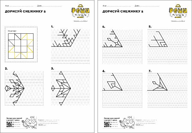 Нужно дорисовать недостающие части симметричных снежинок. Дети осваивают понятие симметрии, учатся точно проводить линии, оценивать размеры, количества клеточек.