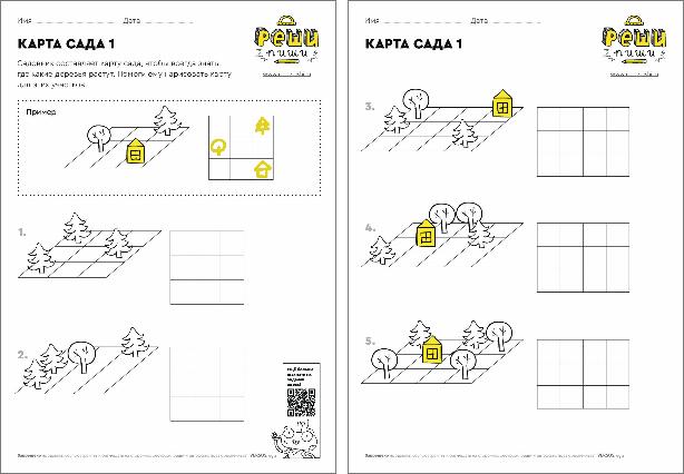 Нужно схематично изобразить деревья и дом на карте сада так же, как и на рисунке. Задание тренирует пространственное мышление и учит видеть шахматную доску глазами соперника.