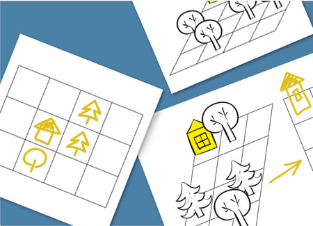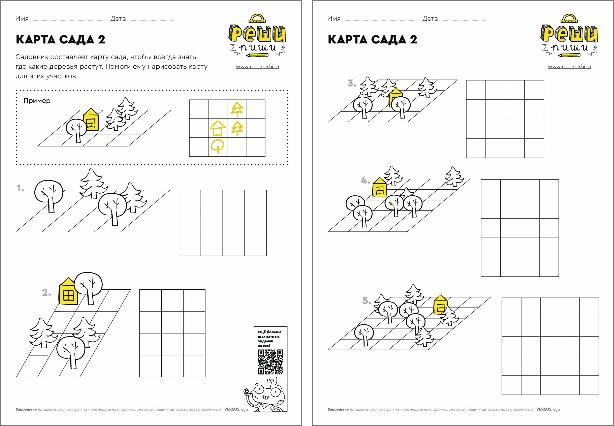 Нужно схематично изобразить деревья и дом на карте сада так же, как и на рисунке. Задание тренирует пространственное мышление и учит видеть шахматную доску глазами соперника.