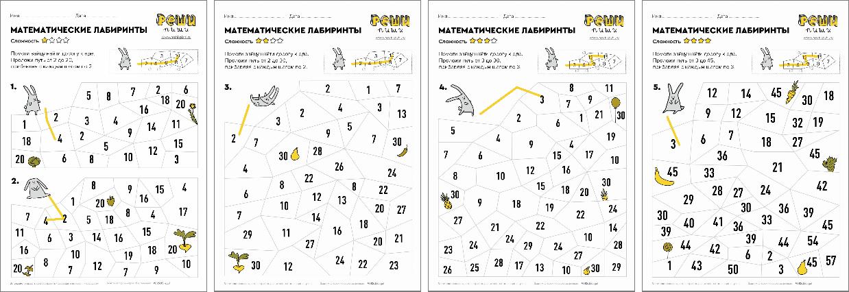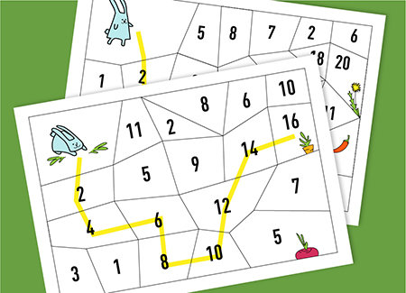 Проложите путь для зайца среди чисел в порядке возрастания, но не последовательно, а с шагом в 2 или 3. Это задание тренирует счёт с шагом и поможет легче справиться с темой умножения.