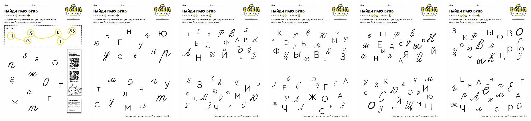 Тренируем внимательность и учимся соотносить печатные и прописные буквы. В задании нужно соединить пару одних и тех же букв, которые могут быть написаны по-разному.