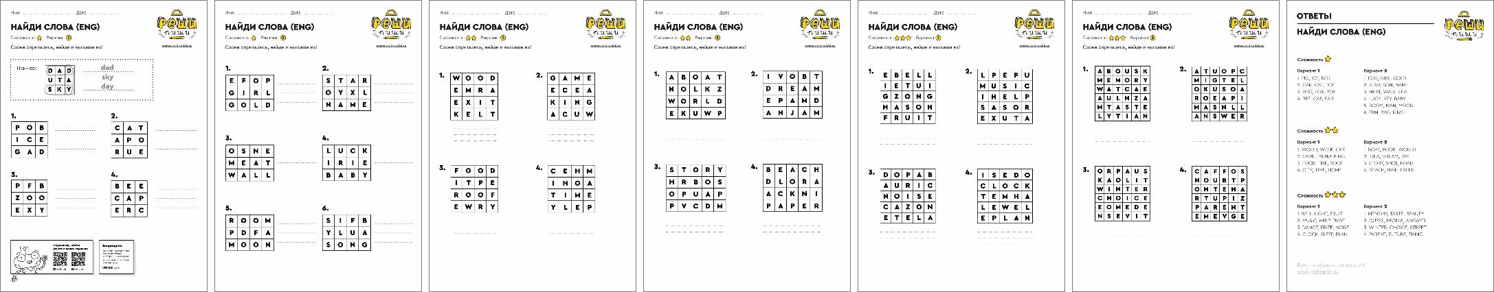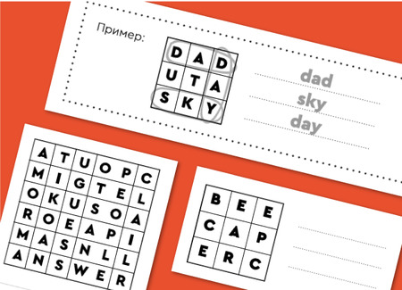 В задании нужно найти, обвести и выписать спрятанные английские слова (по горизонтали и вертикали). Это задание на чтение, внимательность и развитие навыка письма.