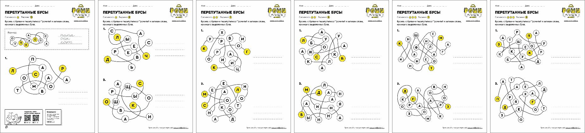 Тренируем внимательность, пространственное мышление, чтение и письмо. В задании бусины с буквами перепутались. Нужно прочитать и записать слова, начиная с выделенных букв.