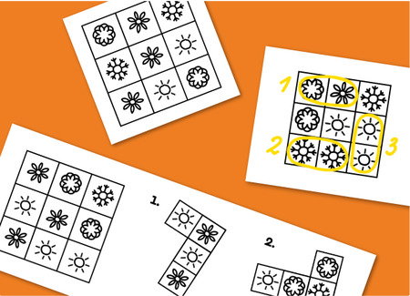 Задание тренирует внимательность, умение сравнивать и соотносить объекты между собой. Среди множества рисунков нужно найти и обвести в квадрате кусочки, изображённые справа. Некоторые из них придётся повернуть.