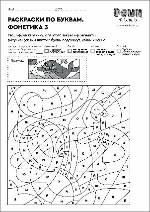 Интересное сочетание тренажёра мелкой моторики и знакомства с буквами. В задании нужно расшифровать картинку. Для этого предложите ребёнку закрасить фрагменты рисунка нужным цветом: буквы подскажут, каким именно.