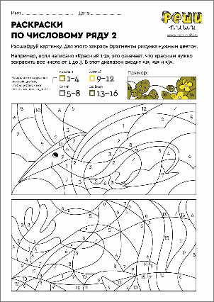 Ориентируемся в числовом ряду и тренируем мелкую моторику. В задании нужно расшифровать картинку. Для этого предложите ребёнку закрасить фрагменты рисунка нужным цветом: числа подскажут, каким именно.