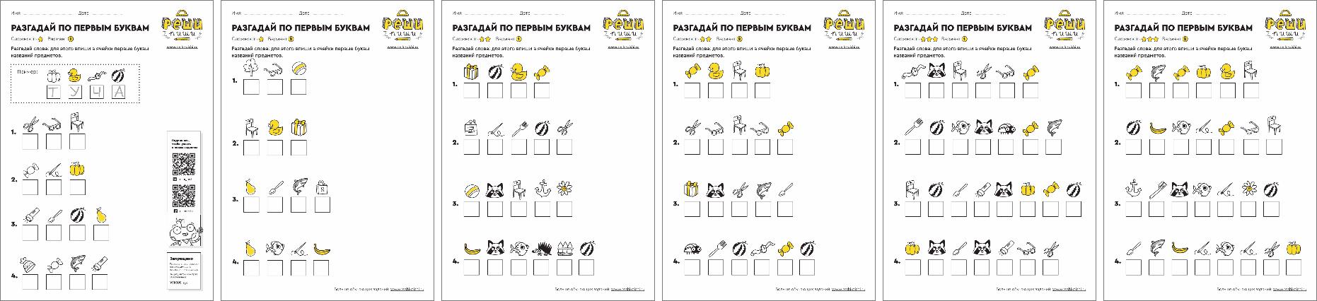 Разгадайте слова: для этого впишите в ячейки первые буквы названий предметов. Задание тренирует умение соотносить звуки с буквами.