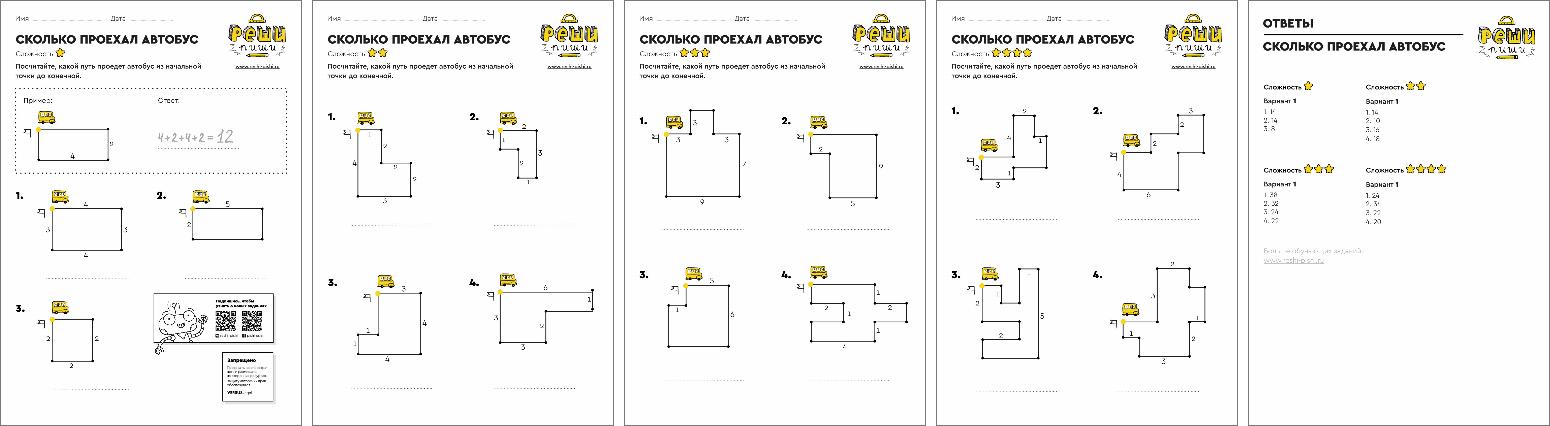 Посчитайте, какой путь проедет автобус из начальной точки до конечной. Задание тренирует сложение и наглядно объясняет суть периметра.