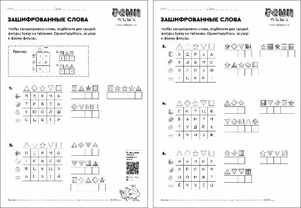 Шифровка для самых внимательных! Определите, какая буква соответствует каждой фигуре, и разгадайте слова. Задание тренирует логику, чтение, письмо и умение работать с таблицами.